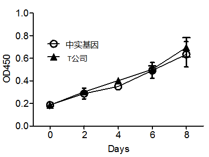 3. 接种后培养使细胞贴壁,然后加CCK-8试剂培养一定时间后测定O.D.值,制作出一条以细胞数量为X轴,O.D.值为Y轴的标准曲线。根据此标准曲线可以测定出未知样品的细胞数量 (使用此标准曲线的前提条件是实验的条件要一致)。
